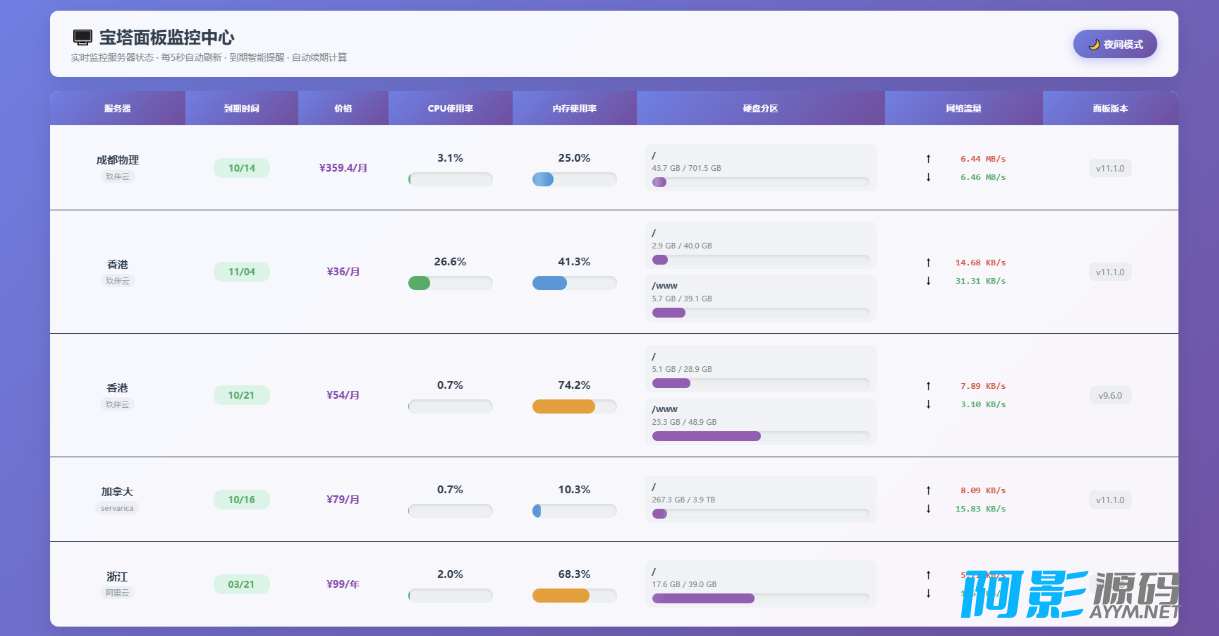 AI编写的一个服务器监控源码 接口使用的宝塔面板api,被监控机器需要安装宝塔面板 将压缩包上传至站点解压,修改“servers.php”内链接信息即可