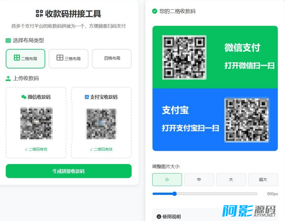一款支付宝和微信合二为一的工具,非常好用,有需要的小伙伴及时收藏!软件是离线版本,双击html文件,用浏览器打开软件。上传相应二维码,然后点生成,在右侧就可拼接出我们需要的二维码。如果你有其他的支付码,也可以使用三格布局或者四格布局。生成后可以调整图片大小,也可以下载到本地。