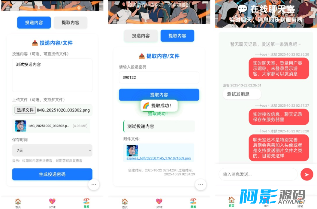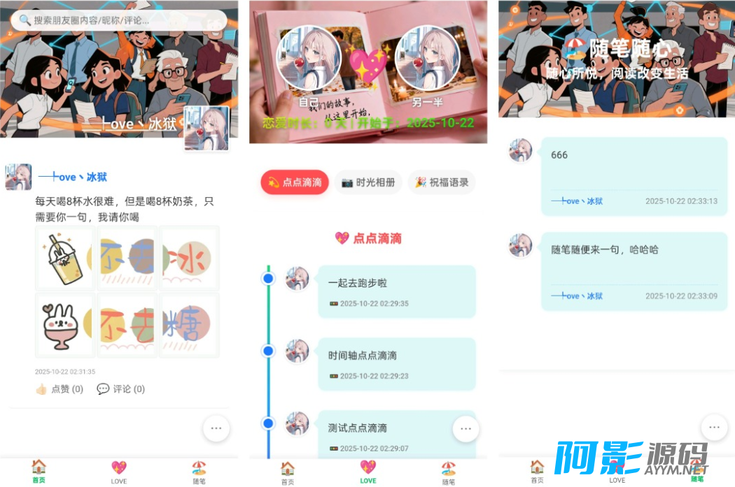 全站无刷新,聊天室实时接收和发送消息,朋友圈首页点击头像登录管理员账号密码:admin/123456,登录后其它页面会有管理员专属发布和修改按钮,恋爱日记的时光相册怎么使用可在我之前发的帖子里找,这里就不多讲了