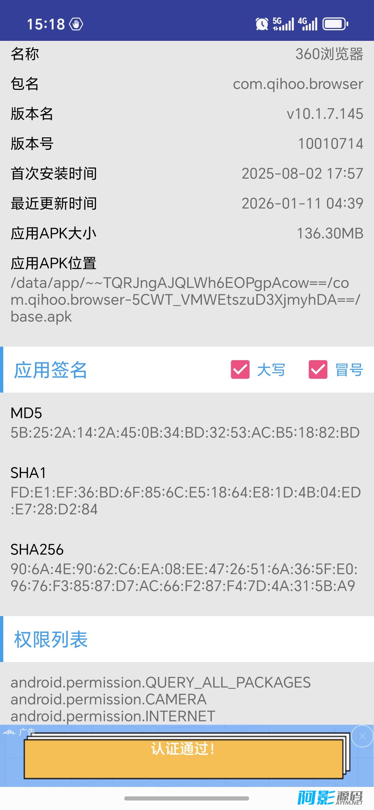 4、apk应用信息提取,包含包名,版本号,MD5,sha256,权限列表等多种应用信息。